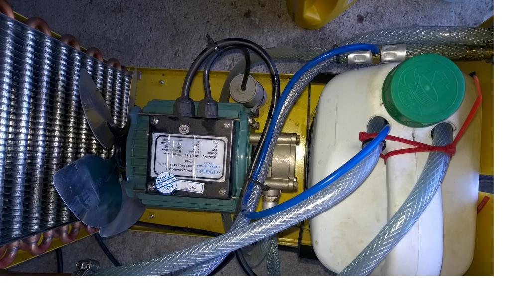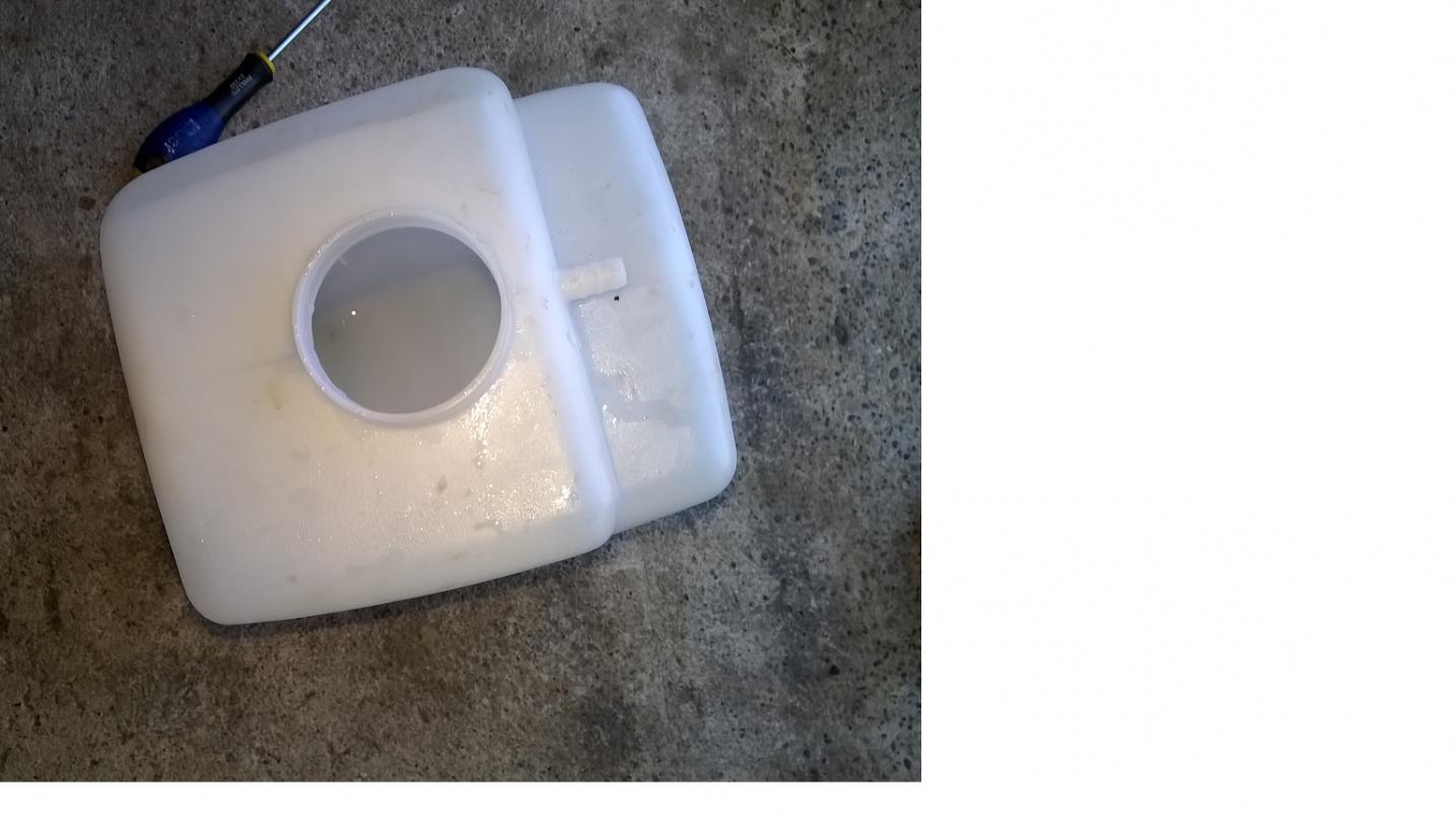 en attendant de trouver ; réparer ou fabriquer un nouveau réservoir pour le refroidisseur j'ai installé un bidon d'essence vide pour moteur deux temps ;) que j ai bien rincé à la place du réservoir percé
