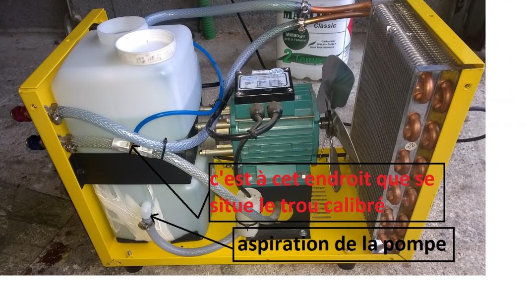 sur la photo en dessous la pièce qui calibre la décharge je la montre par une flèche le passage (trou calibré ) qui alimente le tube bleu doit faire moins de 2 millimètres de diamètre pas plus