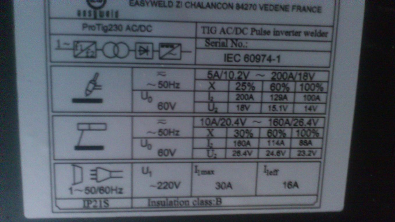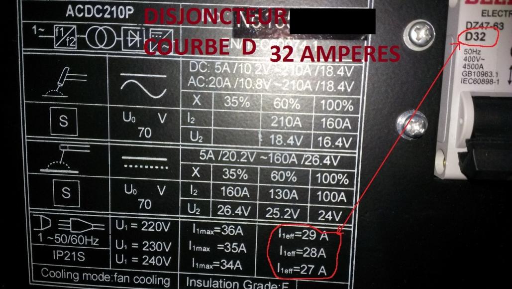 et la lecture de sa plaque signalétique m a fait un peu peur lorsque je l ai vu la première fois j ai testé à 150 ampères en MMA (électrodes de 4 )et je tourne a 18 ampères sur le secteur une fois l arc amorcé