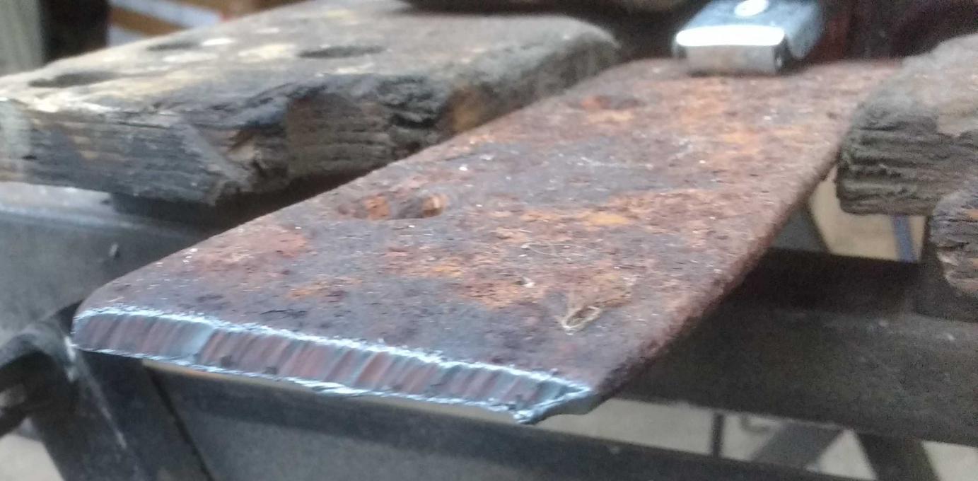 J'ai pris une vieille ferraille qui trainait, c'est une pièce d'usure de charrue agricole bien rouillé, je n'ai pas dérouillé pour le contact de la pince pour voir: eh bien ça marche quand même!!