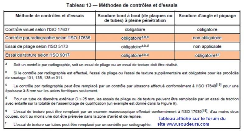 Le mieux pour comprendre la logique des contrôles destructifs d'une qualification de soudeur sur acier est de lire le tableau 13 de la norme NF EN ISO 9606-1 de 2013