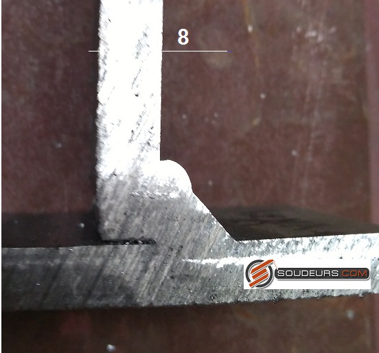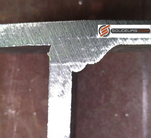 La coupe macrographique montre un beau défaut de symétrie, c'est à dire un mauvais rayon de raccordement en partie haute, alors que c'est conforme au pied de cordon.