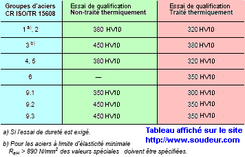 Le tableau 2 de la norme NF EN ISO 15614-1:2005 vous indique les valeurs maximales des filiations de dureté à obtenir en MB, ZAT et MF d'un assemblage soudé.
