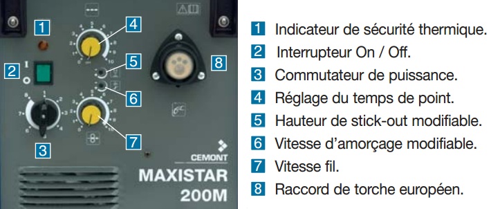 Il n'a pas de temporisation de point ni de frein de dévidage: vous pouvez toujours faire des points en appuyant et relachant la gachette de la torche (qui a un fonctionnement très doux) mais c'est moins pratique et moins précis qu'un poste qui a la temporisation et le frein.