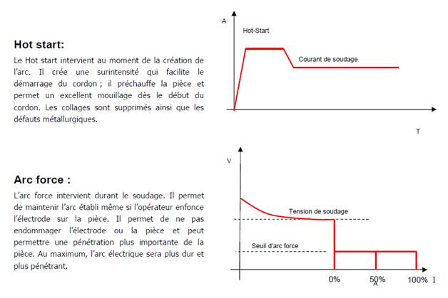 Sur un poste MMA le réglage se fait avec l'intensité, à mon avis l'arc force augmente le voltage et donc accentue la pénétration, quant au hot start, je pense que c'est la même chose mais juste le temps de l'amorçage, cela doit booster la tension d'amorçage .