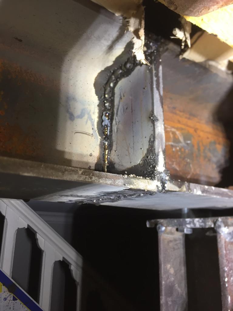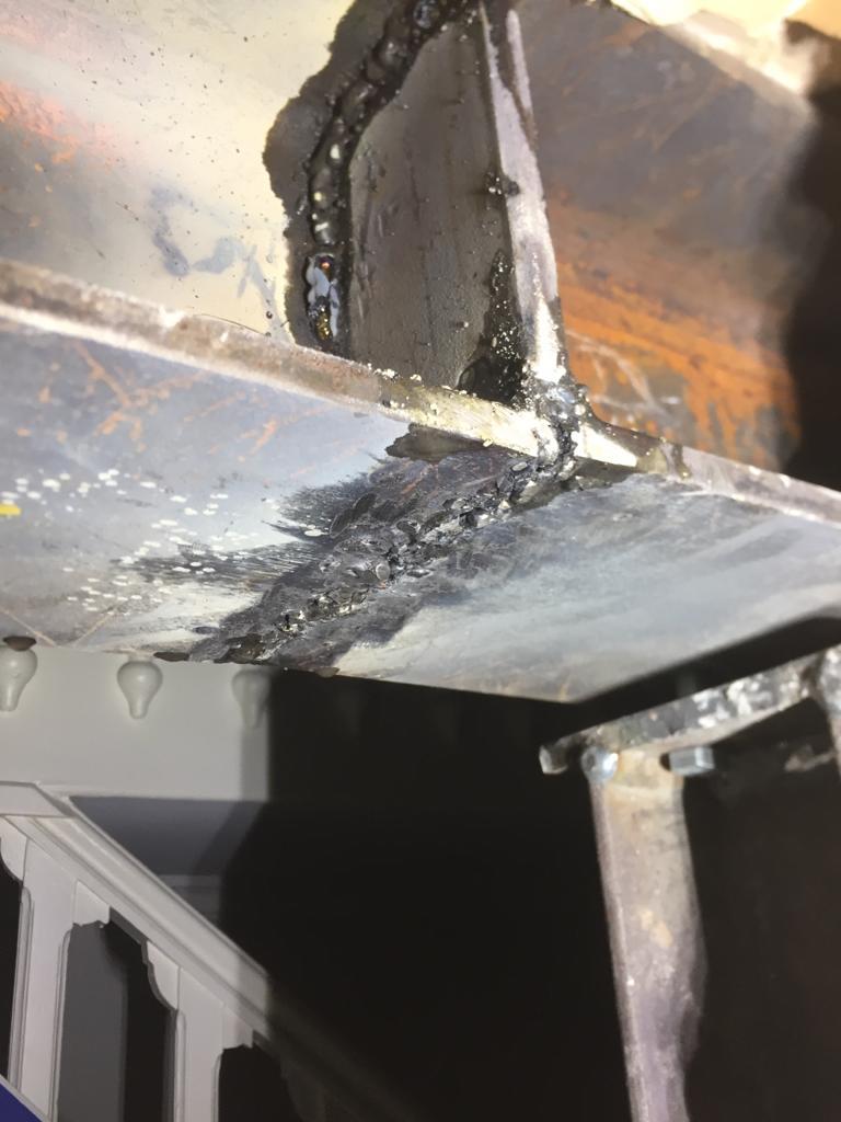 Je n'ai pas trop eu le temps de m'en occuper aujourd'hui, mais l'ingénieur s'accord à dire que la soudure n'est pas belle. Cependant il n'est pas inquiet sur l'aspect technique et recommande de compléter avec des équerres boulonnées. Ce qui est si j'ai bien compris la solution proposée par @tungstene ?