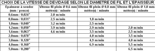 Voici un tableau indicatif des vitesses de dévidage de fil MAG selon le diamètre du fil et l'épaisseur soudée.