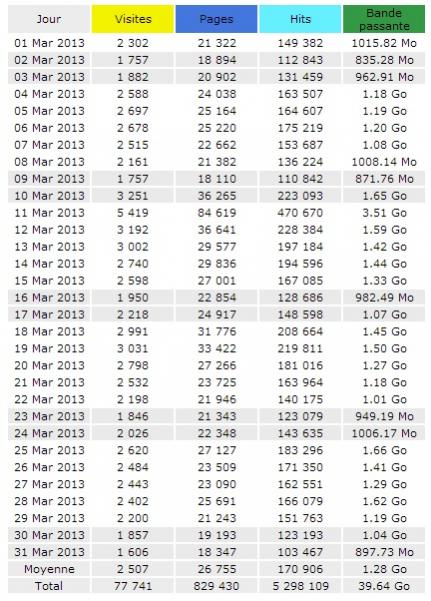 Ce tableau de statistiques du site Soudeurs.com est extrait du logiciel AWstats