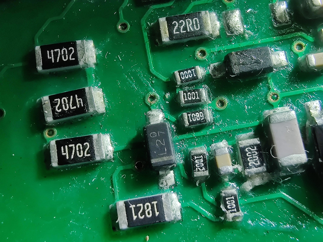 De plus, il faut réparer la carte de puissance en dessous en vérifiant les mosfets et ressouder les colonnettes