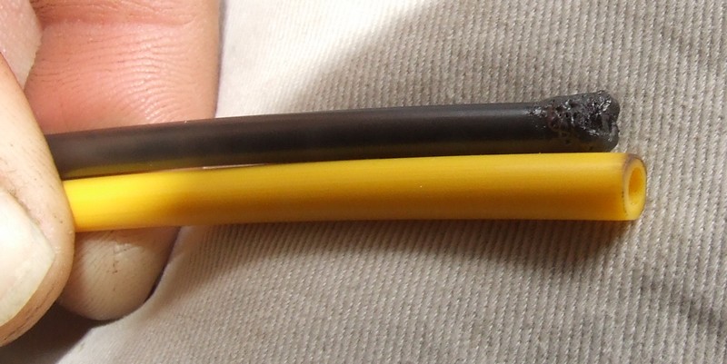 J'ai fais un test avec deux bouts de gaine , 1 teflon ( jaune ) et 1 téflon /carbone sous lesquel j'ai mis un briquet.