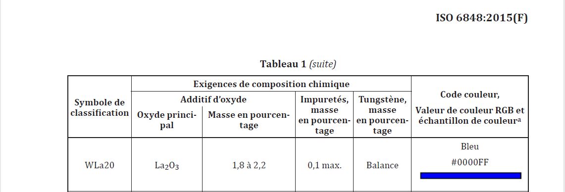 un GRAND merci pour vos retours et le détail apporté dans vos réponses, effectivement historiquement je pouvais utiliser le "DMOS" du client ce jour on me demande de créer mon propre DMOS en fonction de l'iso 6840 & ISO 14343 puis l'iso 24394 et quand je prend connaissance des ces docs je suis balladé de norme en norme mais aucune ne m'explique réellement ce que je dois utiliser en TUNGSTENE.... je suis bien embêté, oui il parait logique d'utiliser 2% de lanthane mais pourquoi ?
