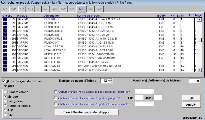 Voici un exemple de tableau de sélection des métaux d'apport du logiciel Soudage 2004 :
