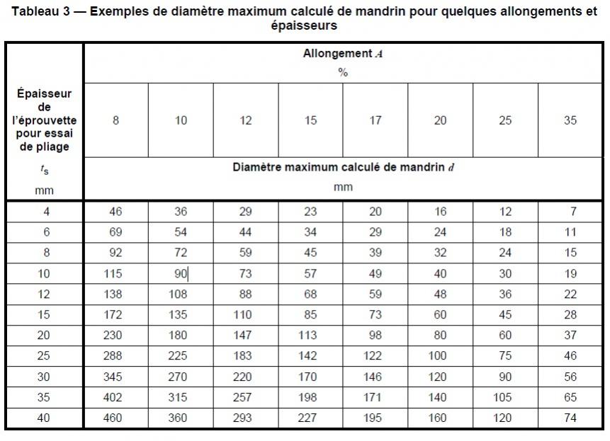 Pour rappel voici le tableau 3 de la norme NF EN ISO 15614-2 concernant les diamètres de poinçon pour réaliser les essais de pliage sur aluminium.