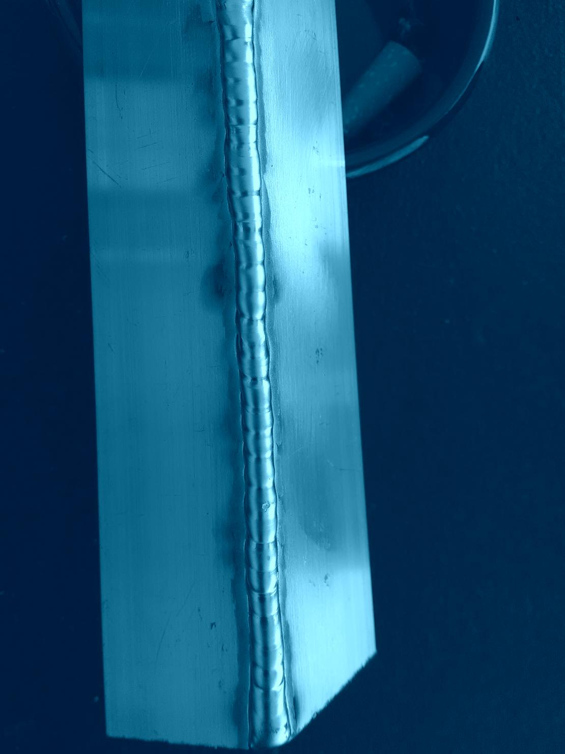 à chaque fois que vous voulez faire une pénétration il faut blanchir l'envers mais surtout faire une carre ( casser l'arête inférieur un coup de lime suffit) si vous ne le faites pas vous serez peut être pénétré mais votre pénétration ne se mélangera pas d'une tôle à l'autre à cause de l'alumine. La gestion des arrêts lorsque l'on pénètre est aussi assez délicat, un arrêt brusque va engendrer va empêcher que la reprise se remélange bien avec la pénétration existantes , il faut anticiper l'arrêt en accélérant pour que la pénétration s'arrête doucement en pente douce, puis reprendre en revenant bien en arrière