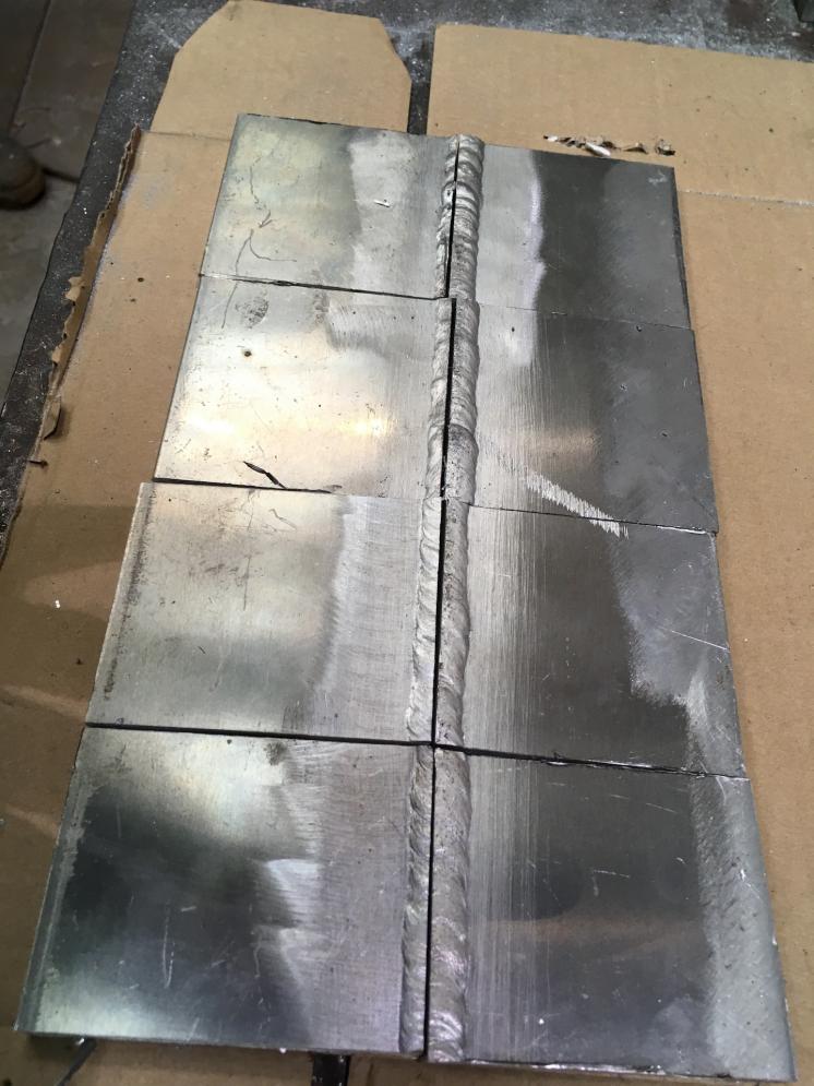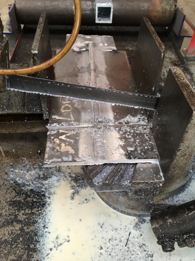 L'éprouvette est coupée transversalement en 4 parties, puis longitudinalement à peu près au centre du cordon (pas tout à fait pour pouvoir observer les soufflures qui se concentrent au centre du joint).